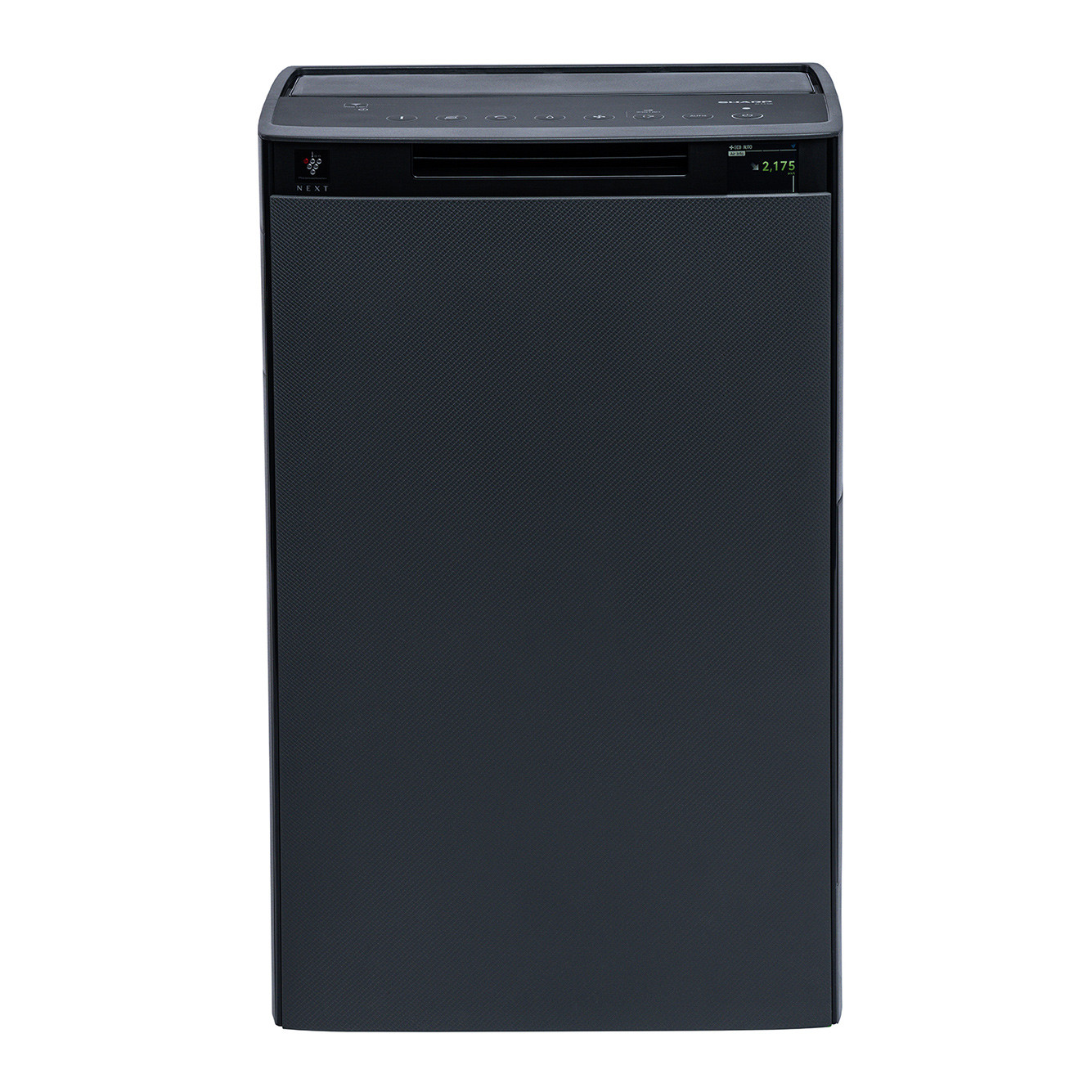 Tuż przed klapą znalazł się panel sterowania z szeregiem dotykowych ikon. Przyciski reagują pewnie, a cały moduł wygląda po prostu nowocześnie. Główny wyświetlacz umieszczono na froncie urządzenia — to kolorowy ekran LCD, na którym zobaczymy m.in. liczbę cząstek w pcs/L, wilgotność, temperaturę oraz animacje pokazujące działanie urządzenia. W rogu znalazło się również dyskretne oznaczenie Plasmacluster NEXT, podkreślające obecność najnowszej generacji jonizacji.